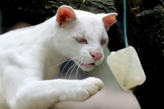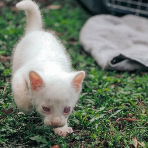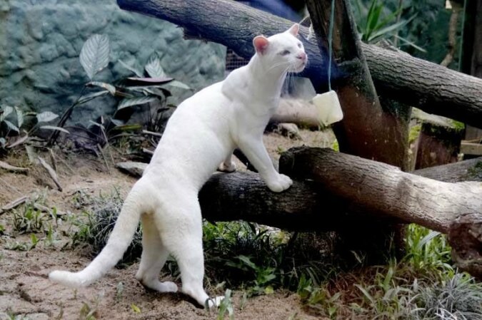 Białe puszyste młode okazało się być dzieckiem jaguarundi. Generalnie takich zwierząt nie spotyka się w kolorze białym, ale ten kotek był wyjątkiem, gdyż był albinosem.