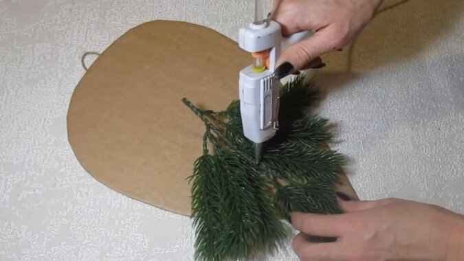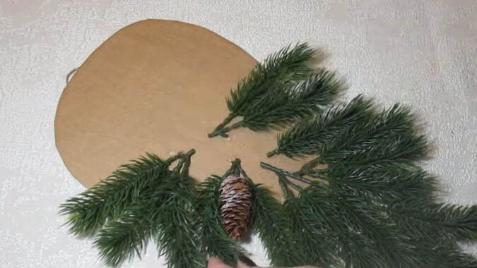 Zaczynając od spiczastego końca na tekturze, przyklej gałązki dookoła. Do kompozycji dodaj również szyszki.