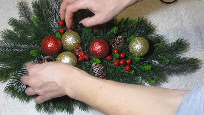Wypełnij środkową część świątecznymi bombkami, owocami i kwiatami.