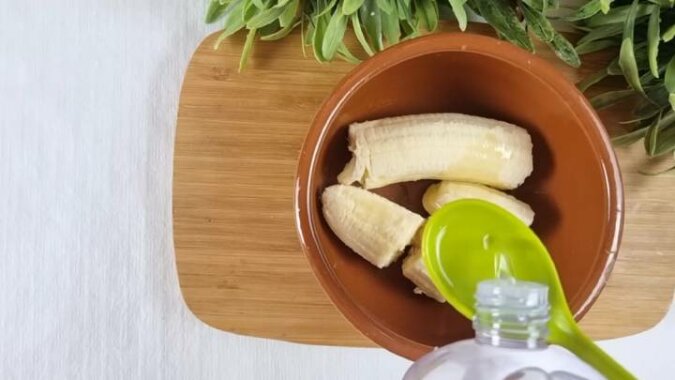 Weź 1 banana, rozgnieć go widelcem. Dodaj 2 łyżki olejku dla dzieci (zastąp oliwą z oliwek, jeśli zawiera substancje chemiczne). Dodaj również odrobinę mleka, aby konsystencja była nieco płynna. Ubijaj mikserem do uzyskania jednolitej konsystencji.