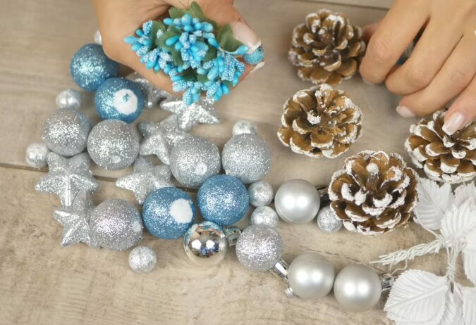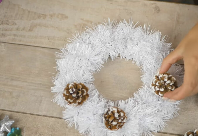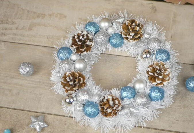 Na przykład, dla białego wieńca świątecznego świetnie się nadają szyszki ozdobne śnieżne (użyj suchego pędzla, aby umieścić trochę farby akrylowej na szyszkach), srebrne i niebieskie dekoracje świąteczne, owoce i białe gałązki ozdobne.