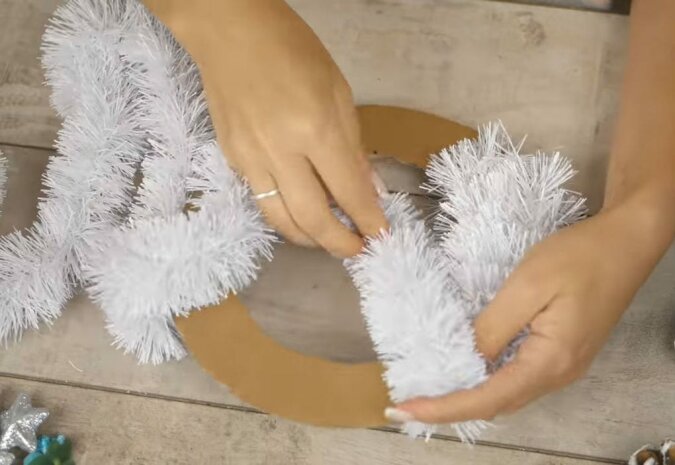 Za pomocą kleju na gorąco narysuj linię na kartonie, przyklej krawędź łańcucha choinkowego i zacznij owijać cały kawałek. Gdy dojdziesz do końca, przyklej drugi koniec łańcucha do kartonu.