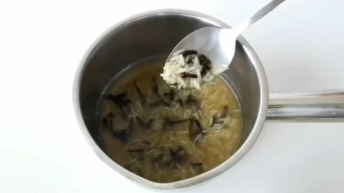 Do rondla wsyp 1 łyżkę ryżu i 1 łyżeczkę goździków. Zalej 1 szklanką wody, doprowadź do wrzenia, gotuj przez 5 minut i wyłącz.