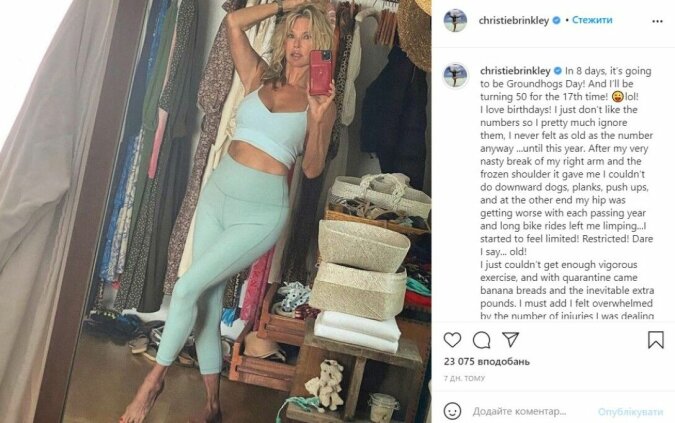 Christie uważa, że sport, ćwiczenia i zdrowe odżywianie pomagają dbać o sylwetkę. Brinkley codziennie robi 100 pompek, do tego pływa i biega. Zachęca też kobiety do tego, by pokochały siebie za to, kim są.