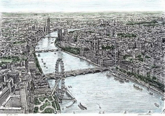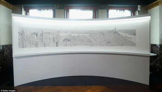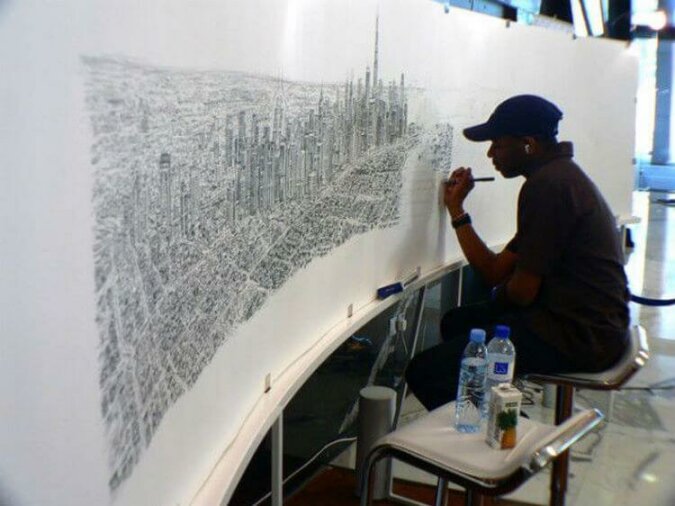 Gotowe dzieło jest sporych rozmiarów. Mężczyzna zapamiętuje szczegóły z precyzją równą aparatowi fotograficznemu. Następnie odtwarza w taki sposób, aby można było wyobrazić sobie, że ogląda się miasto z helikoptera.