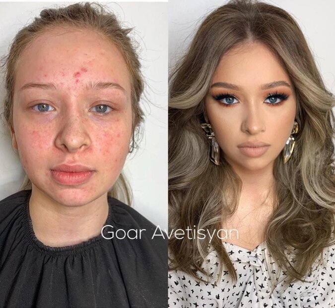 Dziewczyna, która jest niezbyt atrakcyjna i ma trądzik, po wykonaniu makijażu zmieniła się w prawdziwą modelkę o niesamowicie wyrazistym spojrzeniu.