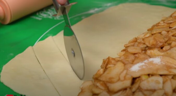 Jedną połowę ciasta rozwałkuj na cienką warstwę i umieść na środku kilka kawałków jabłek.