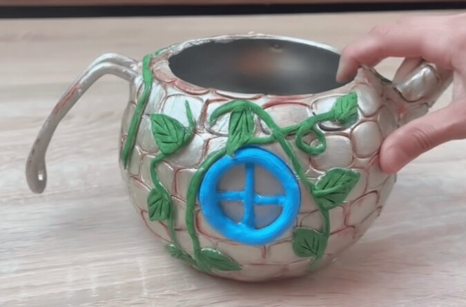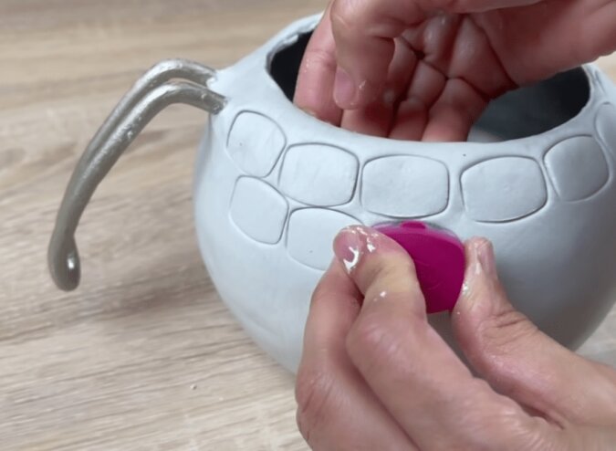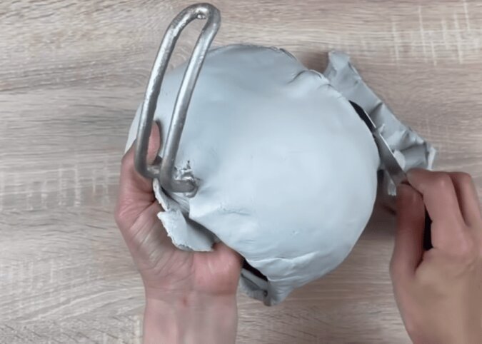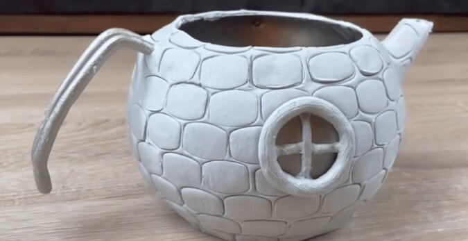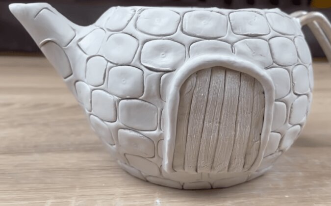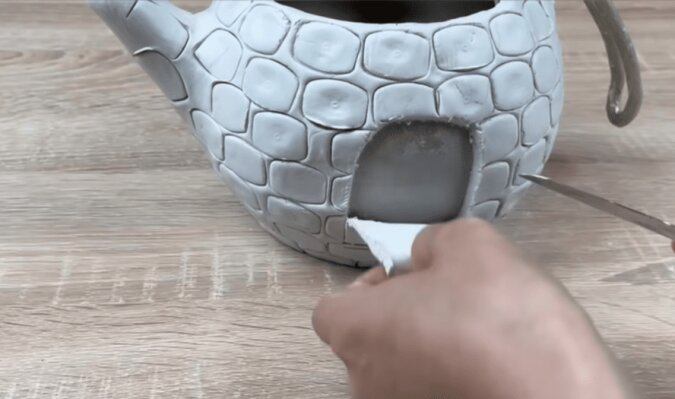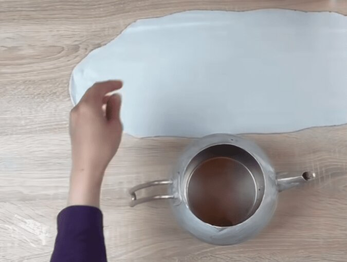 Kolejny krok jest prosty: rozwałkuj cienką warstwę gliny polimerowej. Ten materiał jest wygodny, ponieważ nie zaczyna twardnieć od razu, więc masz czas na to, aby stworzyć dowolny kształt. Najpierw owiń czajniczek, mocno dociskając glinę do powierzchni. W razie potrzeby przytnij, aby zapobiec nawarstwianiu się, i dodaj małe kawałki tam, gdzie chcesz wypełnić luki. Odetnij nadmiar gliny na górze i na dole za pomocą zwykłego noża.
