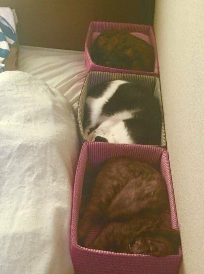 Oczywiście ta metoda nie działa w 100%. Jak widać, 2 z 4 kotów nie chciały wejść do pudełka. Ale wyobraź sobie, że nawet przy takim wyniku będzie o połowę mniejszy hałas! Nic dodać nic ująć, świetny pomysł, dzięki któremu koty są bardzo zadowolone.
