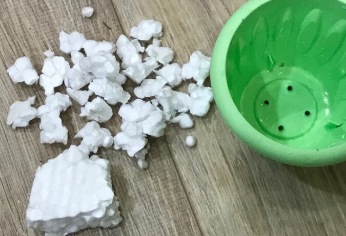 Jeśli macie już przygotowaną odpowiednią doniczkę i ziemię, pozostał jeszcze jeden składnik do zdobycia. Obiecany sekret - w dnie doniczki do sadzenia fiołków zawsze trzeba umieścić styropian. Ten najzwyklejszy, którego jest pod dostatkiem w każdym pudełku ze sprzętem AGD.
