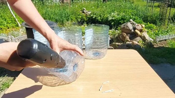 Odetnij szyjkę plastikowych butelek. Z boku, prawie że na samym dole, zrób otwór za pomocą małego gwoździa.