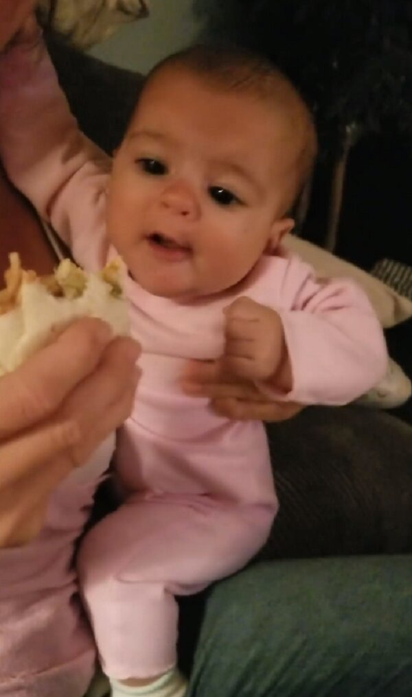 Ona naprawdę tego chce! Jesteśmy pewni, że Riva nie ma jeszcze zębów, więc jeśli by złapała za kanapkę mocno by ją żuła. Jednakże jej to nie powstrzymuje - jest wytrwała!