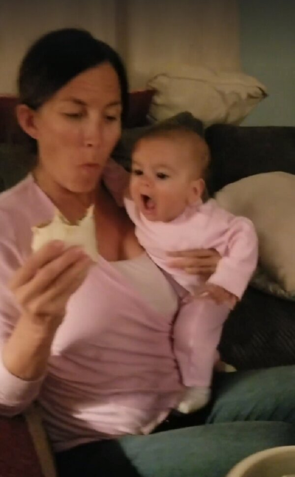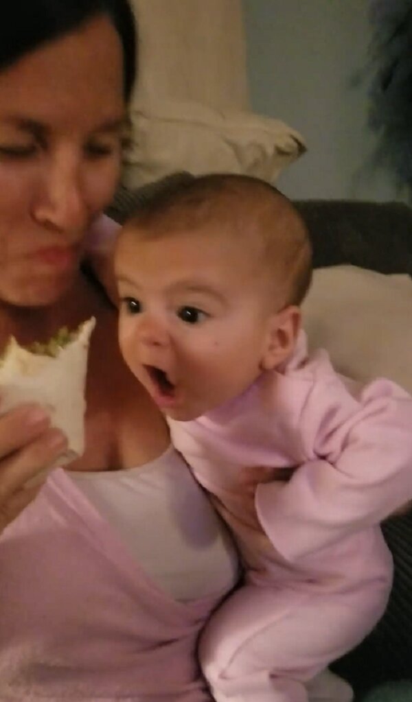 Niemowlęta wymagają dużo opieki i przez połowę czasu mamy są zbyt wyczerpane i zajęte ich potrzebami, by cokolwiek zjeść. Raina Kessel na pewno wie o co chodzi. Na filmie, Raina trzyma swoją córeczkę Rivę Rose i próbuje jeść. Rezultat jest histeryczny.
